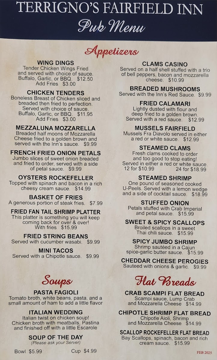 Welcome to Terrigno's Fairfield Inn, where culinary excellence meets inviting hospitality. Nestled in Bridgeton, NJ, this charming eatery boasts a menu that will tantalize your taste buds.